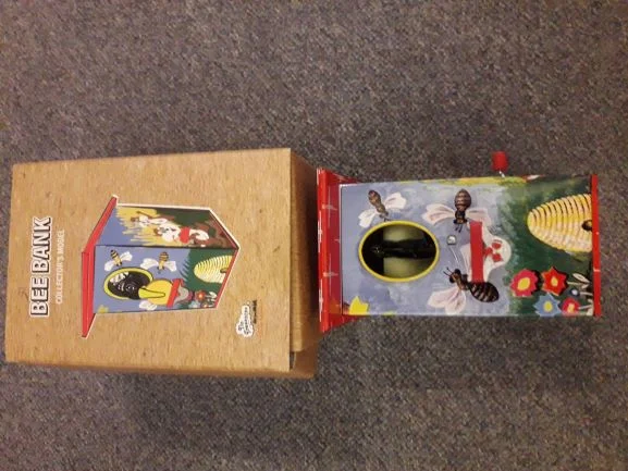 Spardose aus Blech Vogel pickt Münzen in Spardose Bee Bank