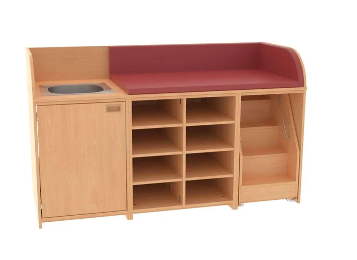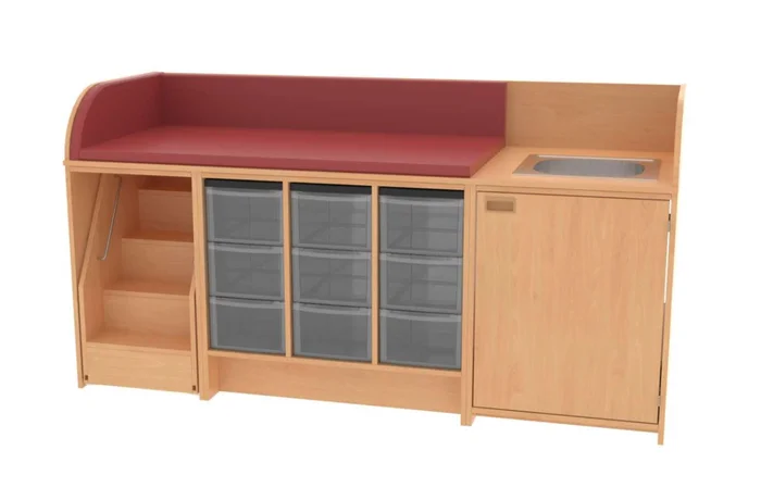 Wickelkommode mit Treppe, Waschbeckenbecken, Unterschränken mit Boxen