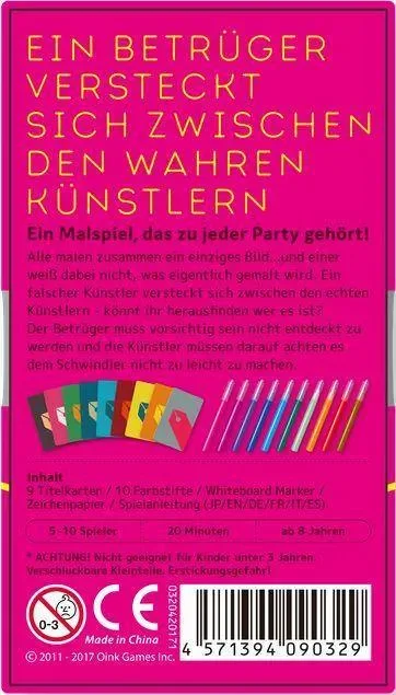 Alle malen zusammen ein einziges Bild…und einer weiß dabei nicht, was eigentlich gemalt wird. Ein falscher Künstler versteckt sich zwischen den echten Künstlern – könnt ihr herausfinden wer es ist? Der Betrüger muss vorsichtig sein nicht entdeckt zu werden und die Künstler müssen darauf achten es dem Schwindler nicht zu leicht zu machen.