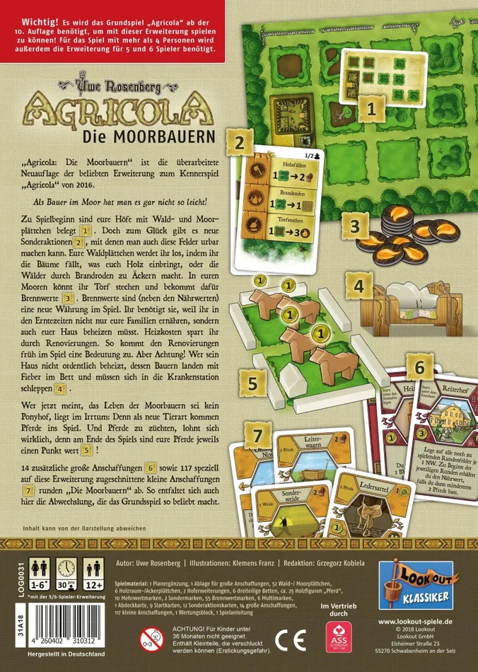 Als Bauer im Moor hat man es gar nicht so leicht! In der Erweiterung Die Moorbauern zum Worker-Placement-Spiel Agricola müssen Moore trockengelegt, Wälder gefällt und das Haus warmgehalten werden. Zu Spielbeginn sind eure Höfe mit Wald- und Moorplättchen belegt. Doch zum Glück gibt es neue Sonderaktionen, mit denen ihr auch diese Felder urbar machen könnt. Eure Waldplättchen werdet ihr los, indem ihr die Bäume fällt, was euch Holz einbringt, oder indem ihr die Wälder durch Brandroden zu Äckern macht. In euren Mooren könnt ihr Torf stechen und bekommt dafür Brennwerte. Diese neue Währung benötigt ihr, weil ihr nun nicht nur eure Familien ernähren, sondern auch euer Haus ordentlich beheizen müsst. Andernfalls landen eure Bauern mit Fieber im Bett und müssen sich in die Krankenstation schleppen. Schließlich führt die Erweiterung Pferde als neue Tierart ein, die am Ende des Spiels Siegpunkte bringen.