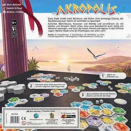 In Akropolis von wetteifern 2-4 Familienspieler ab en um die besten Stadtteile und versuchen, die beste Stadt zu errichten. Dabei müsst ihr euren Steinvorrat im Auge behalten, denn nur so kommt ihr an die besten Teile. Außerdem benötigt jeder der 5 unterschiedlichen Stadtteile unterschiedliche Voraussetzungen und mindestens 1 Agora der eigenen Farbe, um am Spielende Punkte einzubringen.