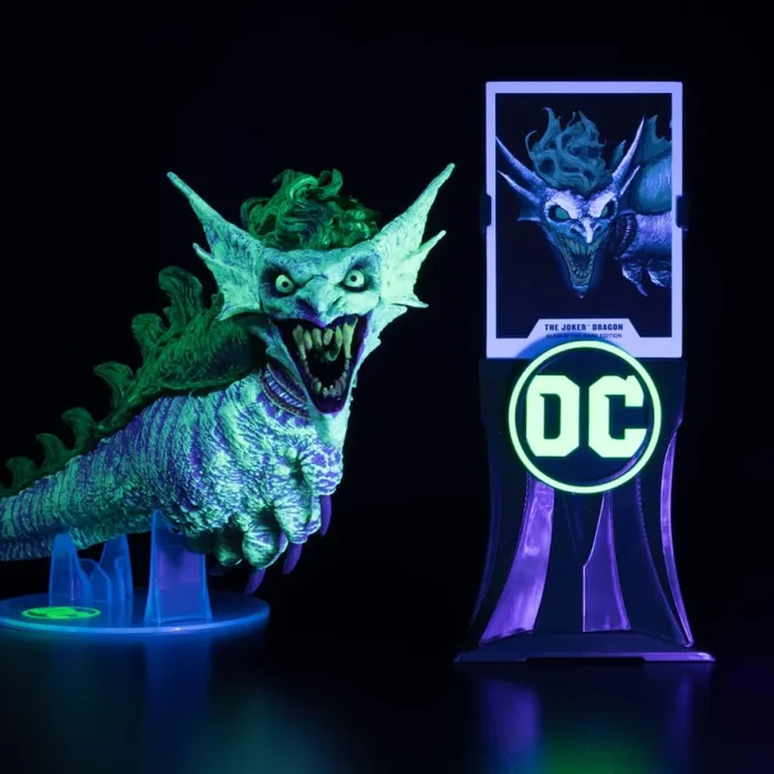 Diese detailgetreue Version des Joker Dragon begeistert mit Glow-in-the-Dark-Farben, einem biegsamen Schwanz und einem beweglichen Kiefer. Dank des mitgelieferten transparenten Ständers kannst du den Drachen imposant präsentieren. Zusätzlich erhältst du eine Sammelkarte mit Fotomotiv und Hintergrundinfos zur Figur – perfekt für Fans, Sammler und Liebhaber des DC-Multiverse.