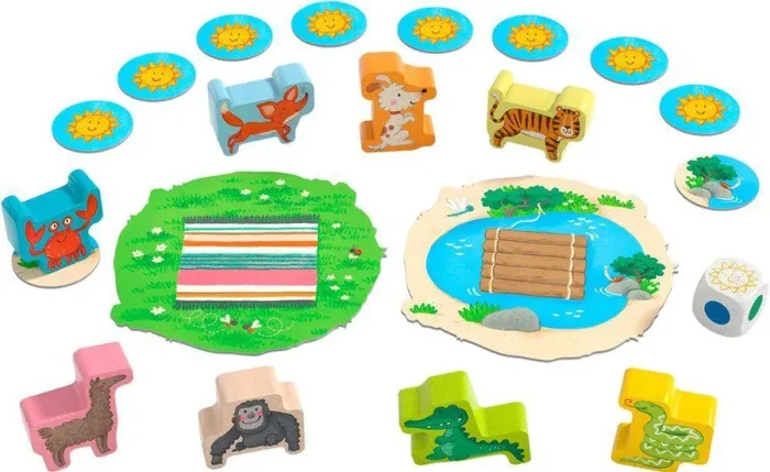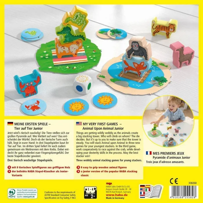 Jetzt wird’s tierisch wackelig! Beim HABA Stapelspiel Meine ersten Spiele – Tier auf Tier Junior stellen sich die Tiere zur großen Pyramide auf. Wer klettert auf wen? Das finden die jungen Stapelkünstler heraus, indem sie würfeln. Doch ob der tierische Turm auch hält, liegt in der Hand der Spieler: In drei Stapelspielen bauen sie Tier auf Tier. So landen das Krokodil auf dem Hund und die Schlange auf dem Affen. Im dritten Spiel liefern sich die Spieler zudem gemeinsam ein Wettrennen mit dem Krebs. Mit Meine ersten Spiele – Tier auf Tier Junior von HABA trainieren die Jüngsten spielerisch ihr Fingerspitzengefühl. Am Ende gewinnt der beste Stapelkünstler.