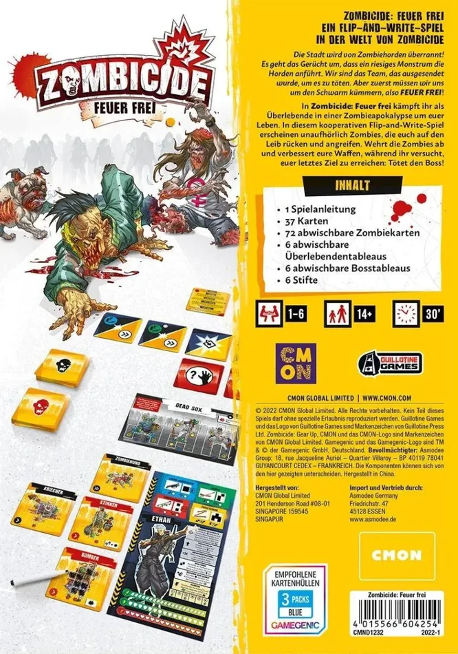 Zombicide: Feuer frei ist ein kooperatives Flip-and-Write-Spiel für 1 bis 6 Überlebende, die in einer Zombie-Apokalypse um ihr Leben kämpfen. Die Überlebenden sind Elitekämpfer, die sich auf die von Untoten überrannten Straßen begeben haben. Dort müssen sie Zombiehorden abwehren, die erscheinen und sich auf sie zubewegen, bis der Boss auftaucht. Dann müssen die Überlebenden ihr letztes Ziel erreichen: den Boss erledigen und so die Zombie-Invasion beenden!